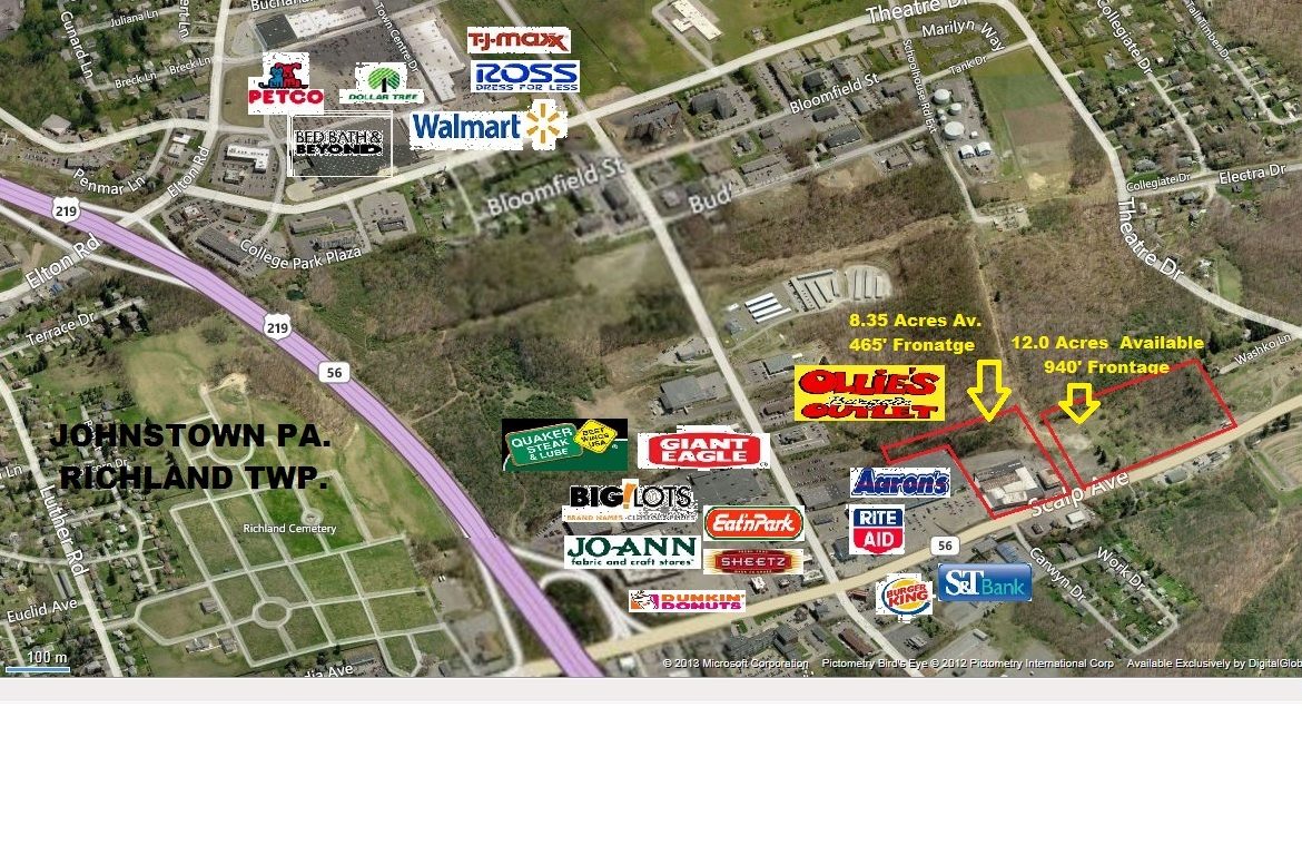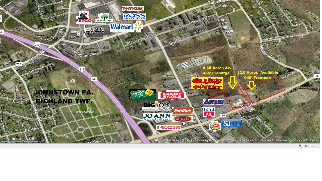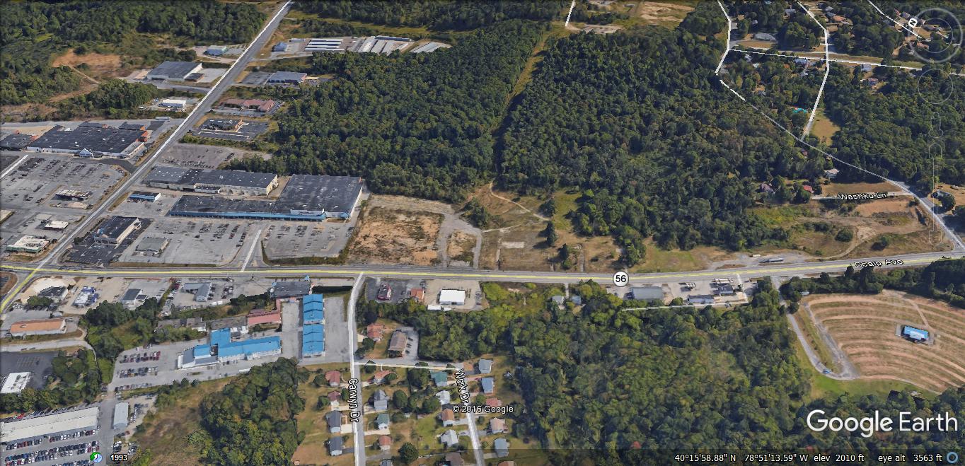 25.0+/- Acre site perfect for Retail, Hospitality and Medical Commercial Development. Approximately 2,100′ of frontage on the most active retail route in Cambria County (Johnstown) Richland Twp. Traffic counts are listed at 25,000 cpd. The tract is located on Rte. 56 (Scalp Ave.) and is in close proximity to most of the major retail in Johnstown Pa. The site is directly adjacent to the East Hills Plaza (Olllies) on Scalp Ave.